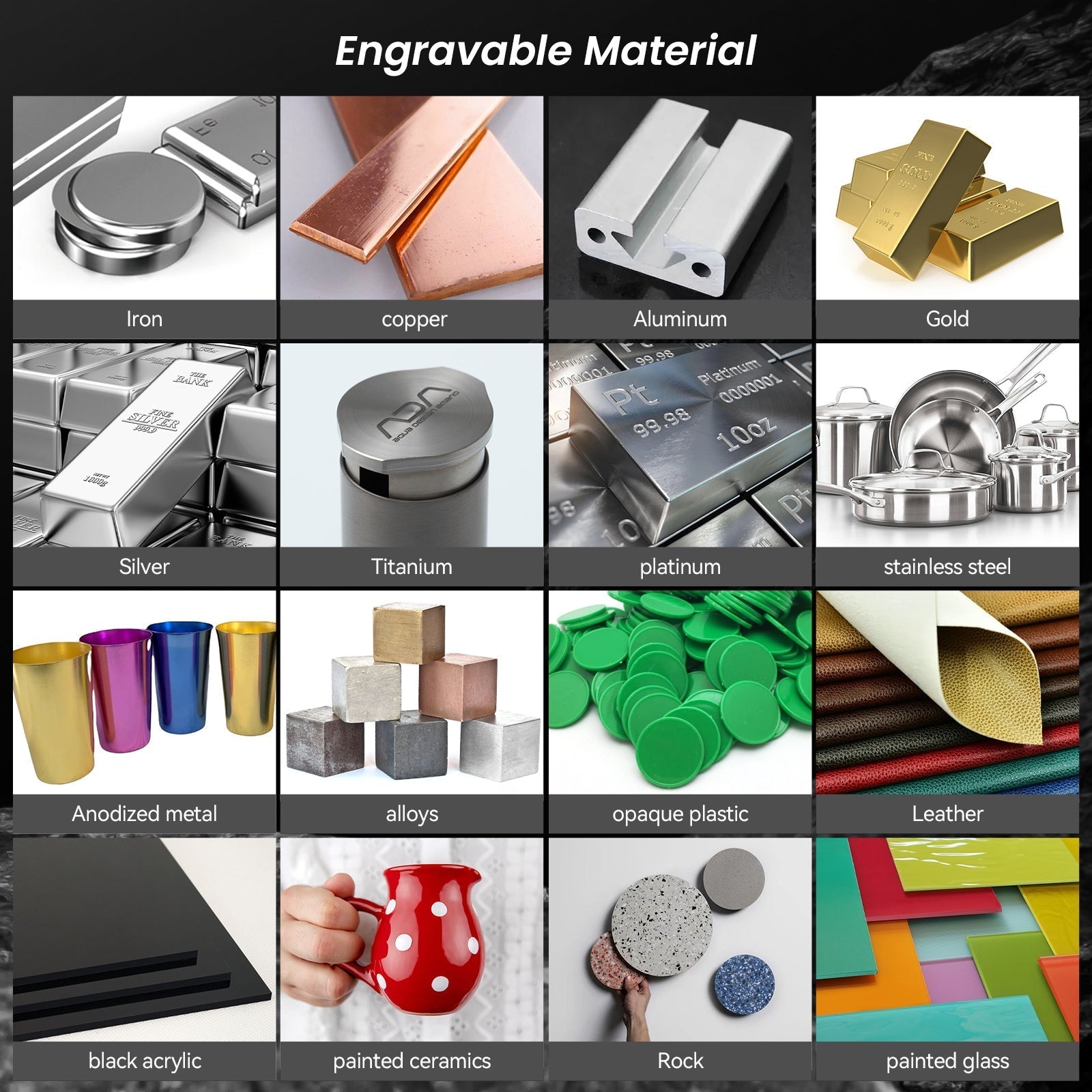 Multi-Material-Anwendung: IKIER 20W Infrarot-Laser-Gravur-Maschine, kann auf alle täglichen Metall (Kupfer, Eisen, Aluminium, Zink, Silber, etc.) und Kunststoff High-Speed-Feingravur, sondern auch in schwarzem Acryl, Leder, Keramik und Rock Gravur angewendet werden;
